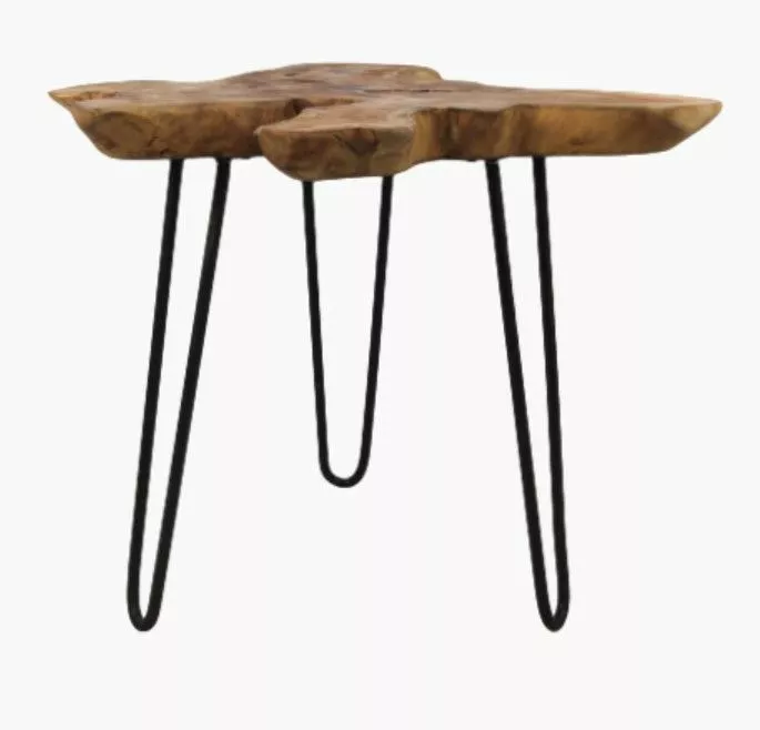Pöytätason luonnolliset puumuodot yhdessä jalkojen metallin kanssa antavat tälle pöydälle vankan, mutta modernin ilmeen, joka on toivottava lisäys melkein mihin tahansa olohuoneeseen.