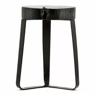 Siro ja moderni kolmijalkainen sivutaso/jakkara jossa kansi rouheasta mangopuusta